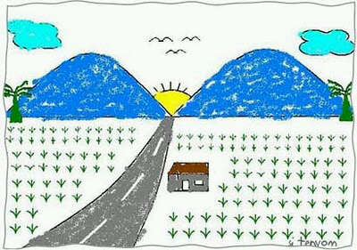 Contoh pemandangan alam ini tidak hanya berupa pemandangan alam gunung dan sawah namun berbagai macam objek dengan tema pemandangan alam. Menggambar pemandangan ini bisa diawali dengan sketsa pensil terlebih dahulu atau langsung dengan crayon.