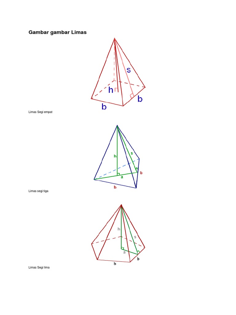 Pengertian limas limas adalah bangun ruang yang memiliki sisi ataupun bidang samping berbentuk segitiga dengan puncak pada bagian atasnya berdasarkan kamus besar bahasa indonesia pengertian bangun ruang limas yaitu benda ruang dengan bentuk alas segitiga segi empat atau sebagainya sesuai dengan bentuk limasnya dan bidang sisi berbentuk segitiga yang memilki titik puncak berimpit. Limas segi lima ialah limas yang mempunyai alas berbentuk segi lima baik segilima teratur maupun segi lima sembarang. Setiap sudut poligon terhubung ke puncak tunggal yang memberikan limas memiliki bentuk yang khas.